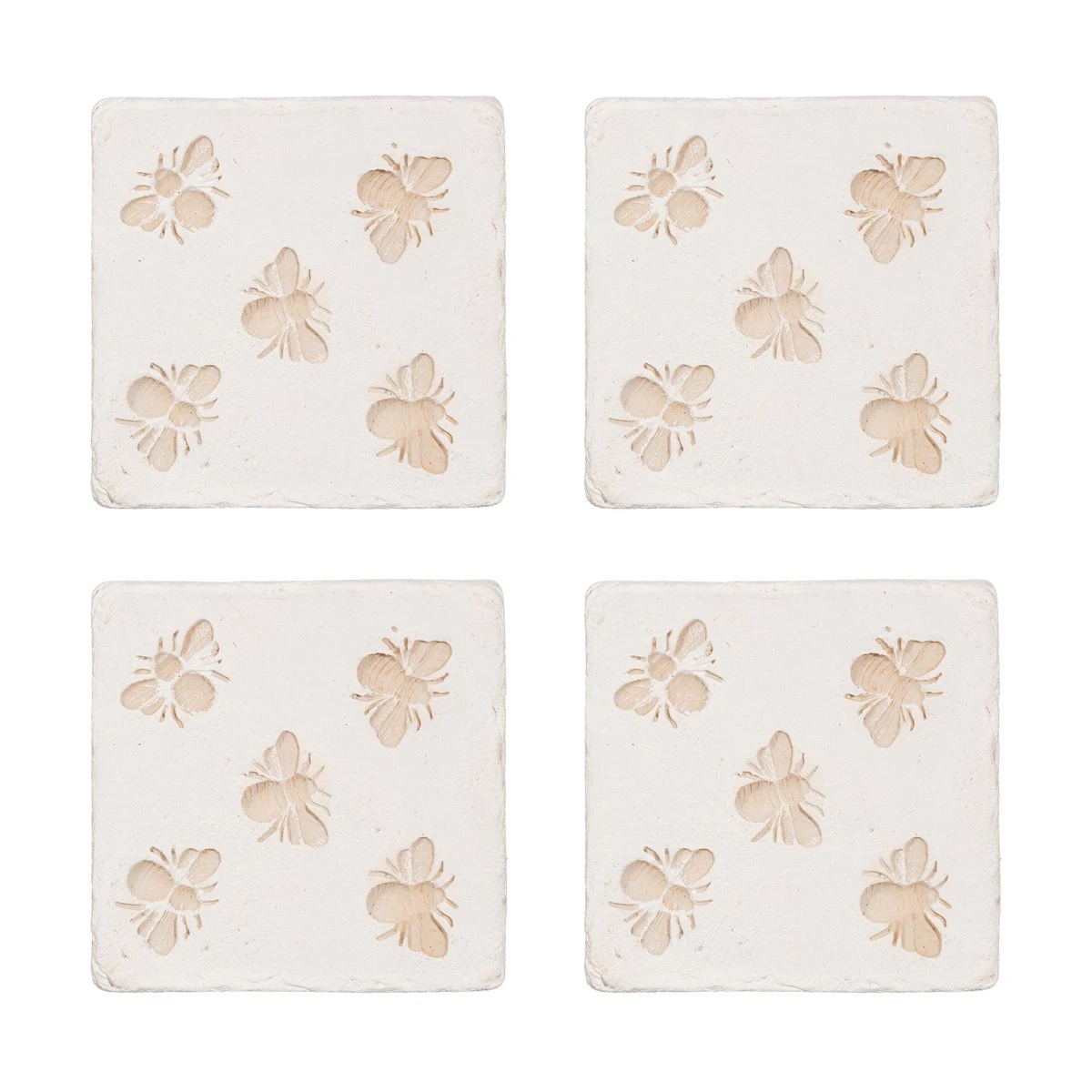 Bring the buzz of the bees to your coffee table with this set of four coasters. Square in shape, this set features a neutral white-wash colourway with an imprinted bee design. Perfect for keeping the joy of the sunny seasons in the home all year.