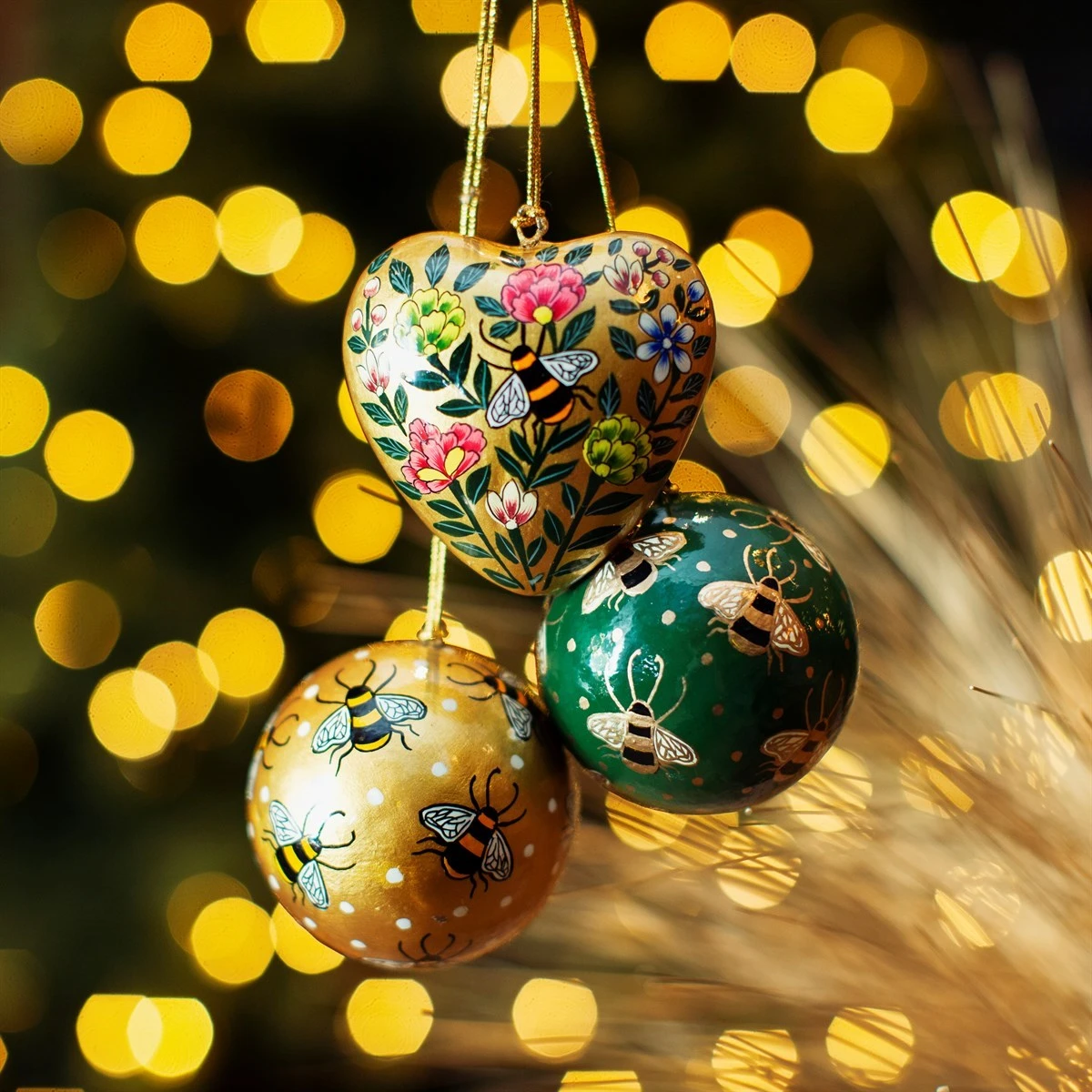 Bring the buzz of the bee to your evergreen with this beautiful papier mache bauble. Hanging pretty from the string, fall in love with the green and gold colourway across the repeat pattern of bees. Designed to celebrate these beautiful insects in winter, and remind us of their importance in our gardens and fields.