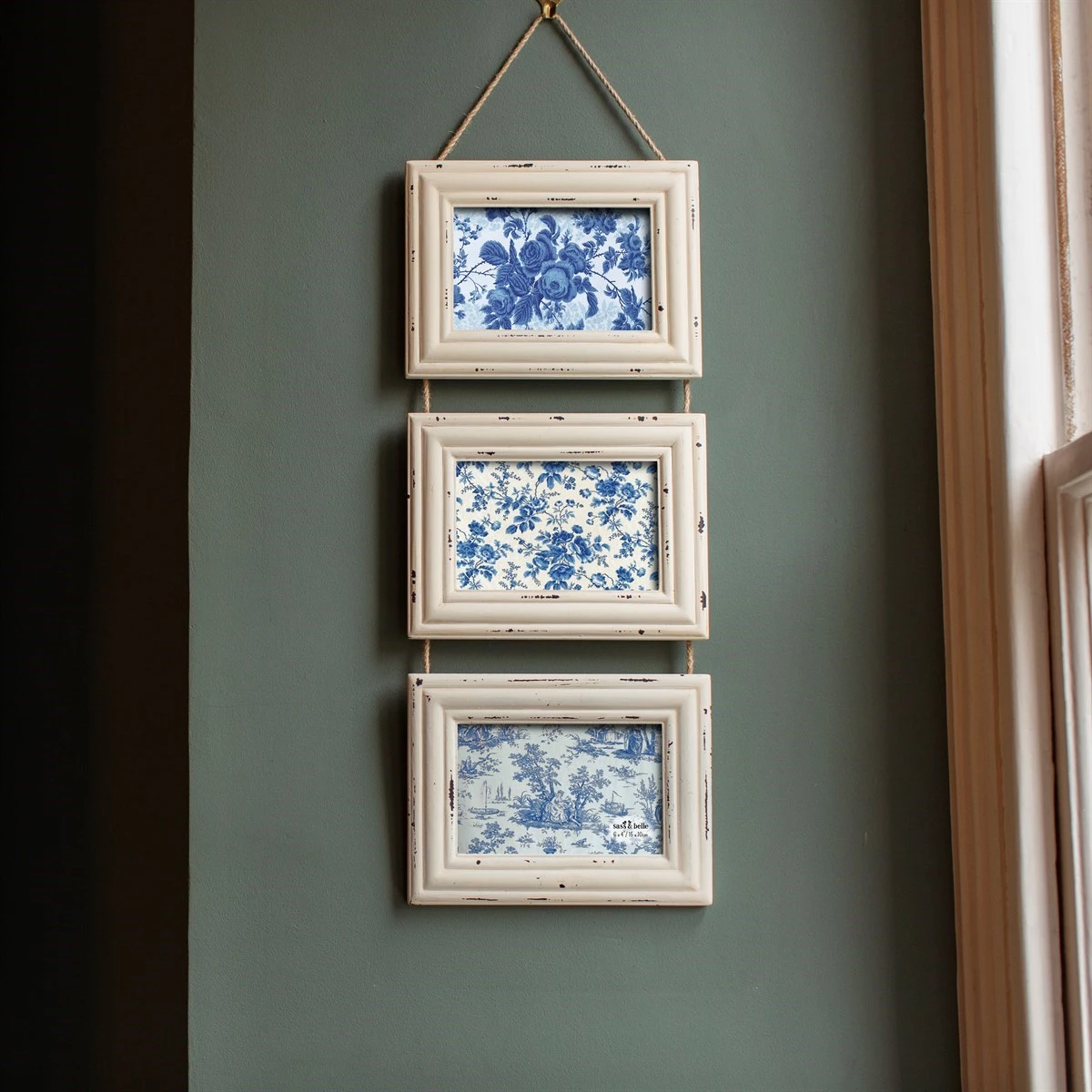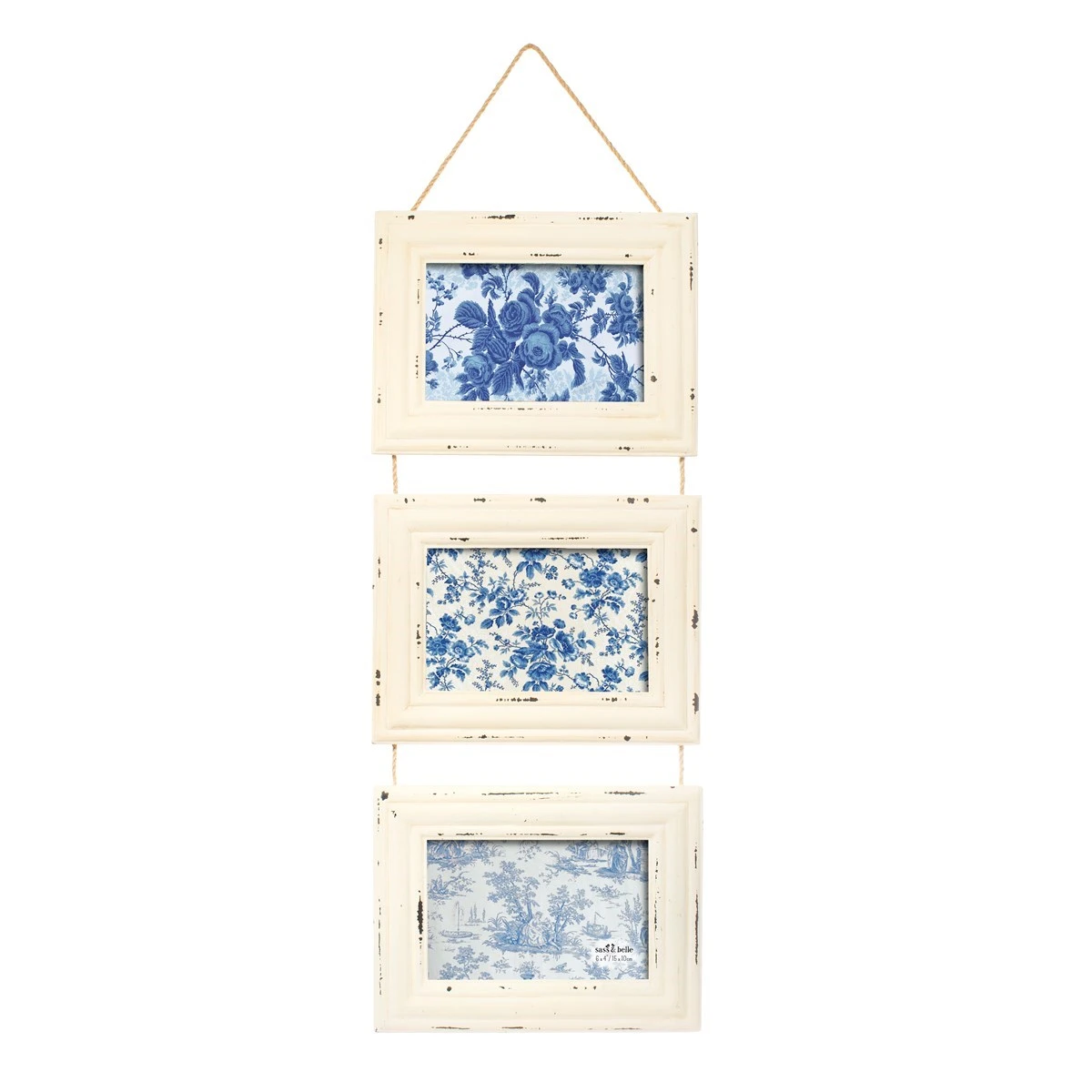 Whether it’s a wedding or birthday, capture memories of the happy times in this shabby chic hanging photo frame with three landscape apertures. Featuring a colourway of soft white, embrace the vintage paint wash and natural texture of the string.