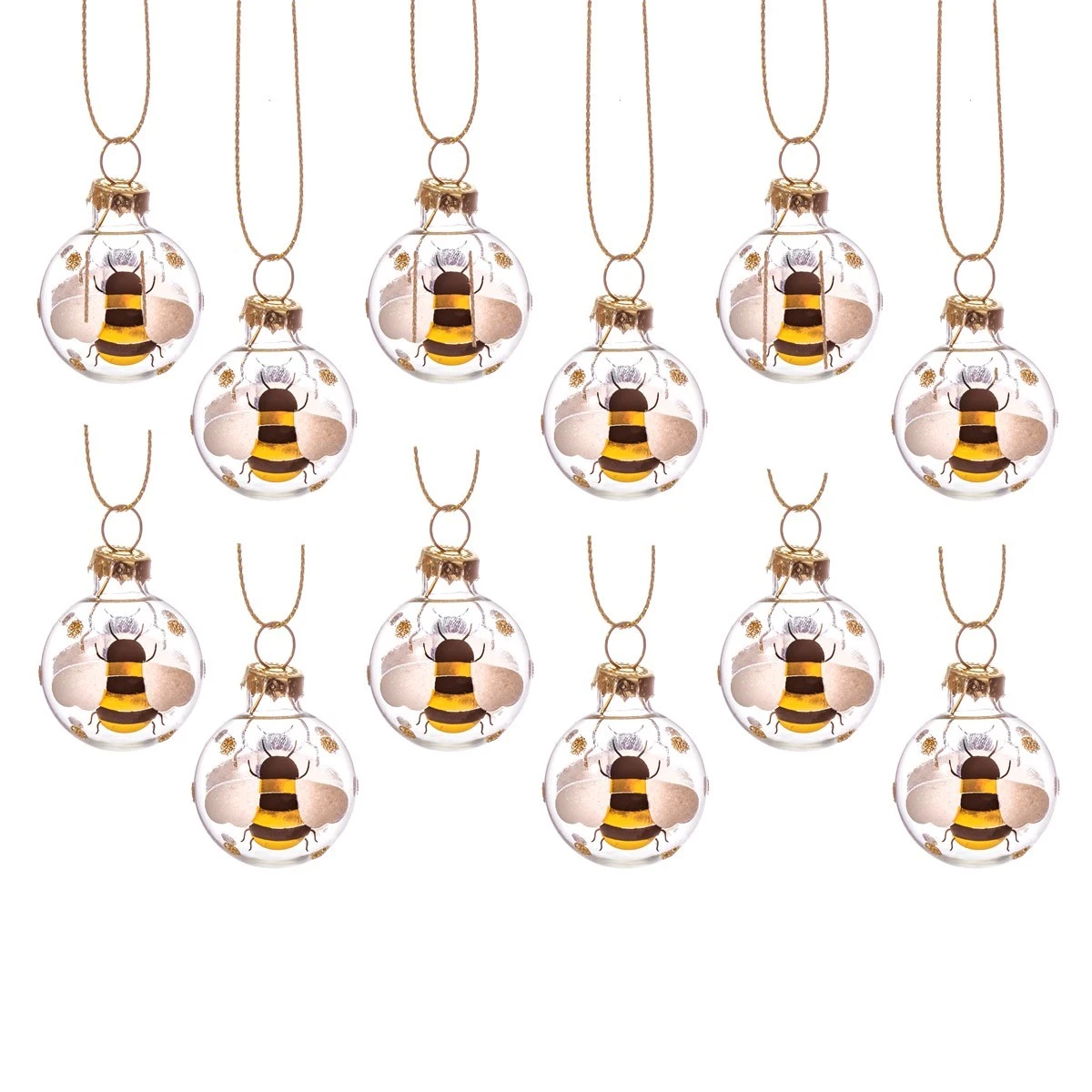 Step into a world of golden sparkle this Christmas and bring a special buzz to the tree. This set of twelve mini baubles are made from glass and feature our beautiful bee design. The iridescent gleam of these decorations highlights the twinkle of Christmas joy.