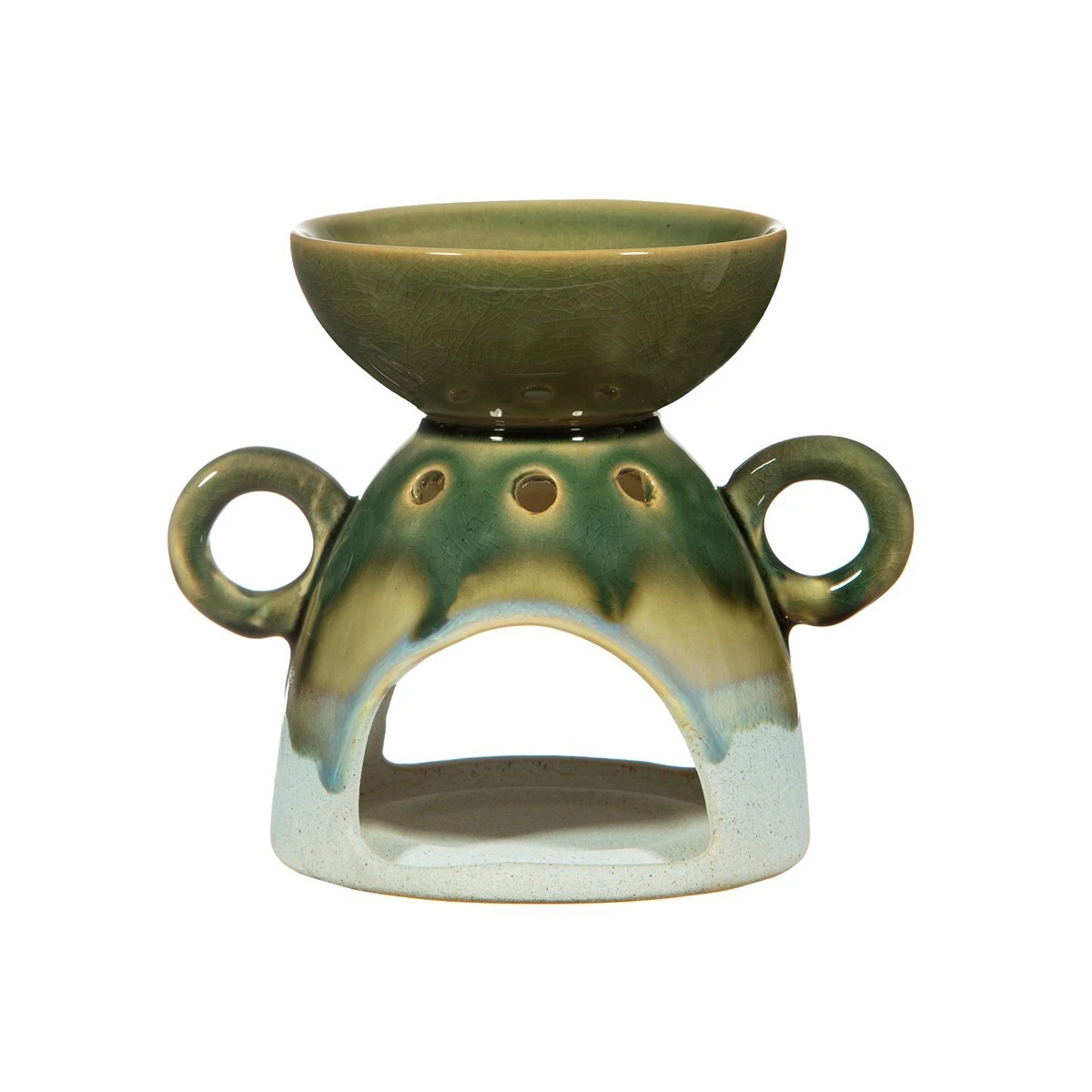 Scent your home with a touch of bohemian style. Our gorgeous Mojave oil burner features a mellow colourway of tonal green, created from a reactive glaze technique which forms subtle variations in colour tones, making each one beautifully unique. You’ll find a deep dish on top to hold the essential oil of your choice. Pop a tealight into the chamber below to infuse your surroundings with beautiful fragrance. Completed with a gloss finish. This home fragrance accessory can be used to with essential oils or wax melts.