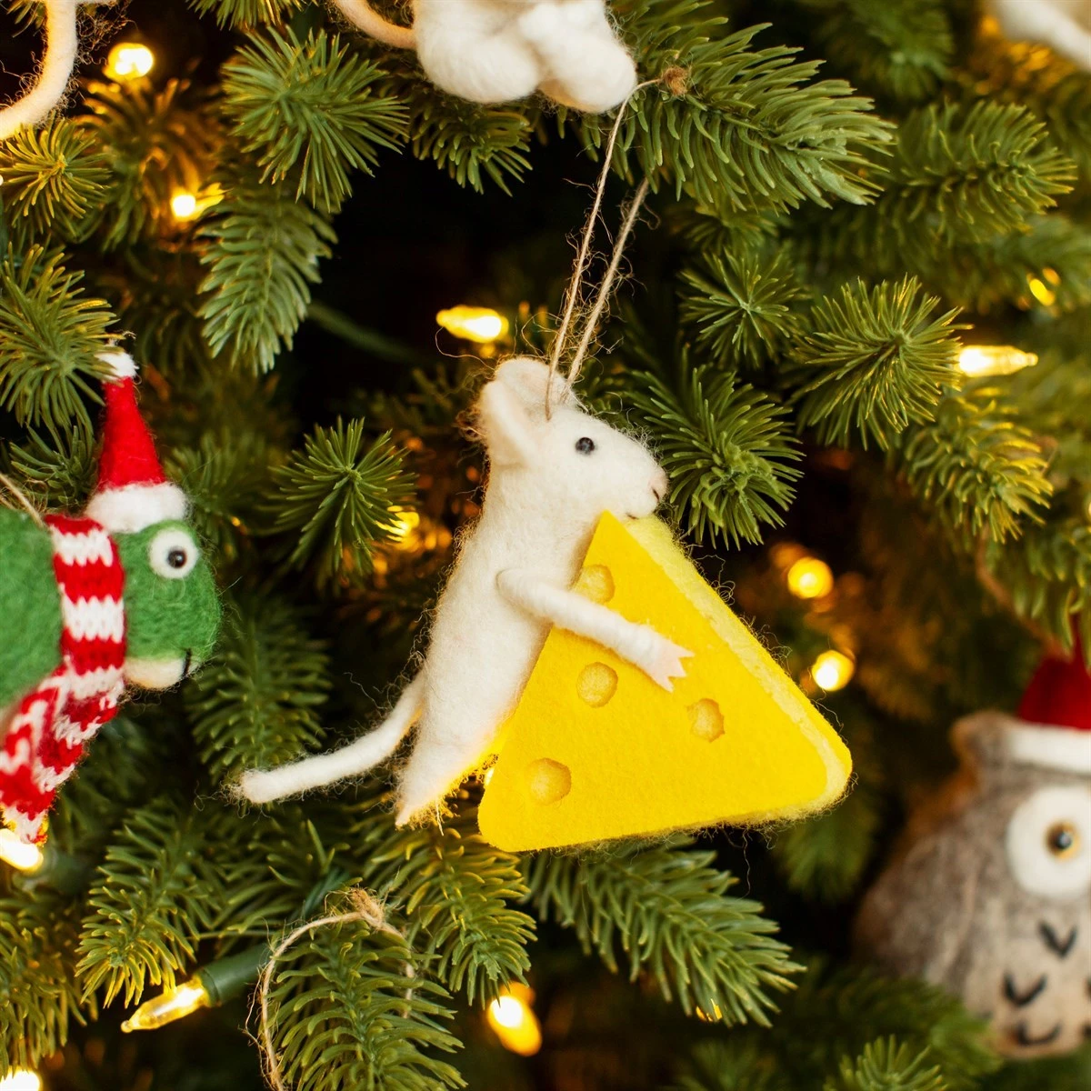 So cute you’d let him steal the cheese! Crafted from felt in a fluffy white and cheddar yellow colourway, this adorable mouse decoration is a joyful addition to your Christmas tree.