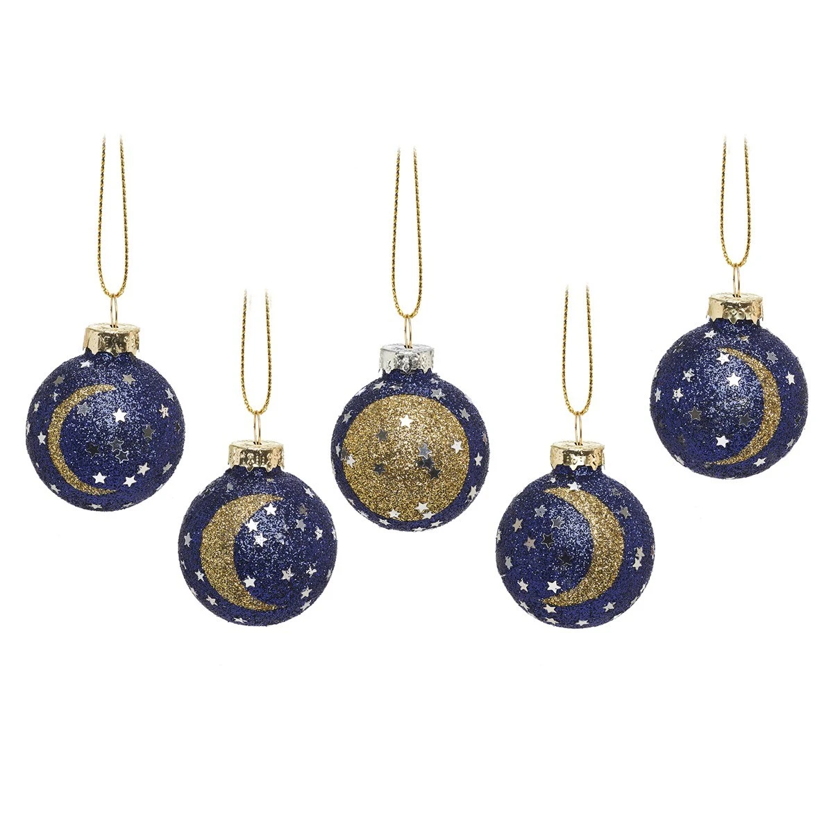 Lift off this Christmas on a space adventure with our set of five luna baubles. From full moon to half-crescent, admire the glimmering design that features the full phase cycle. The gold and dark navy colourway is sure to catch the eyes of every guest over the festive season.Â