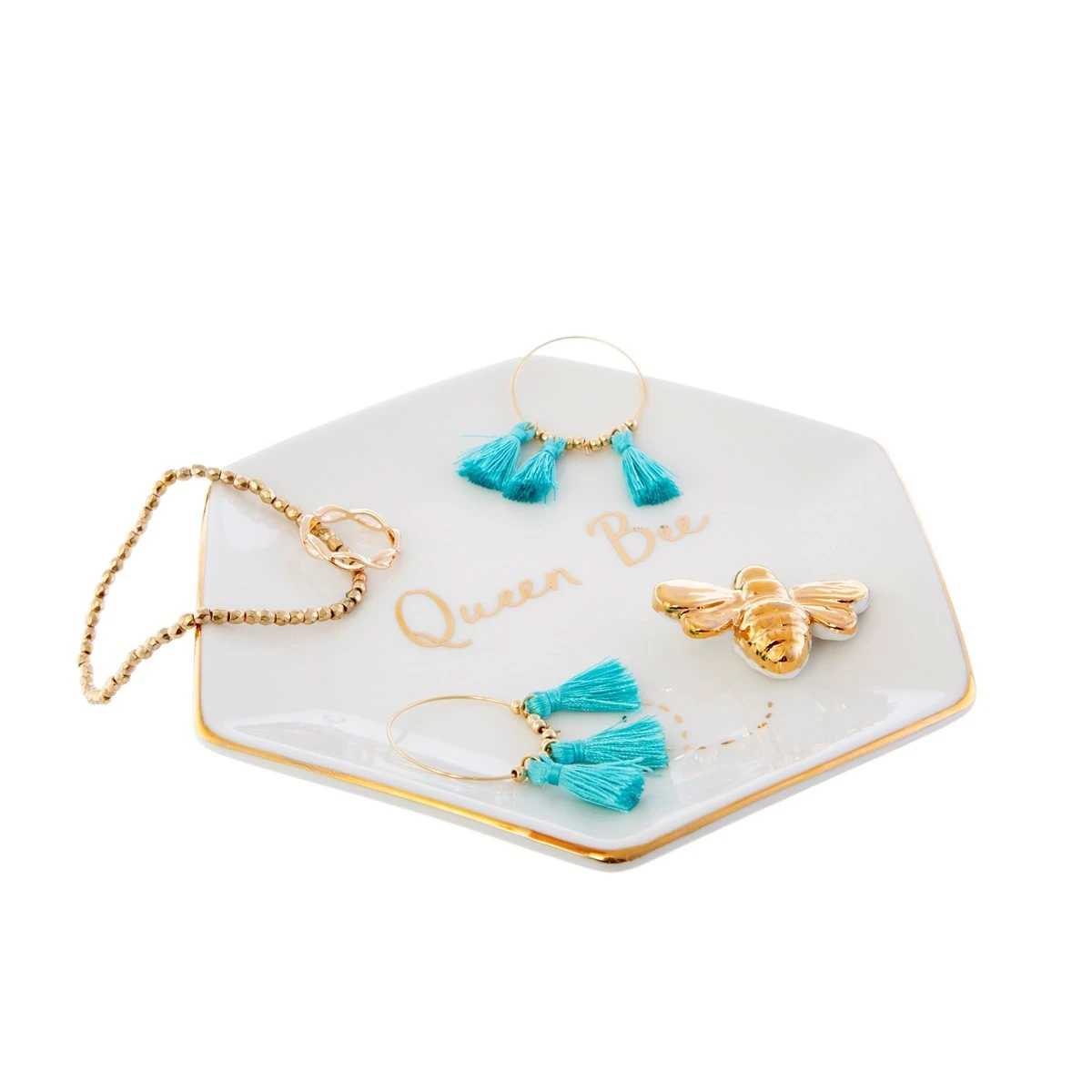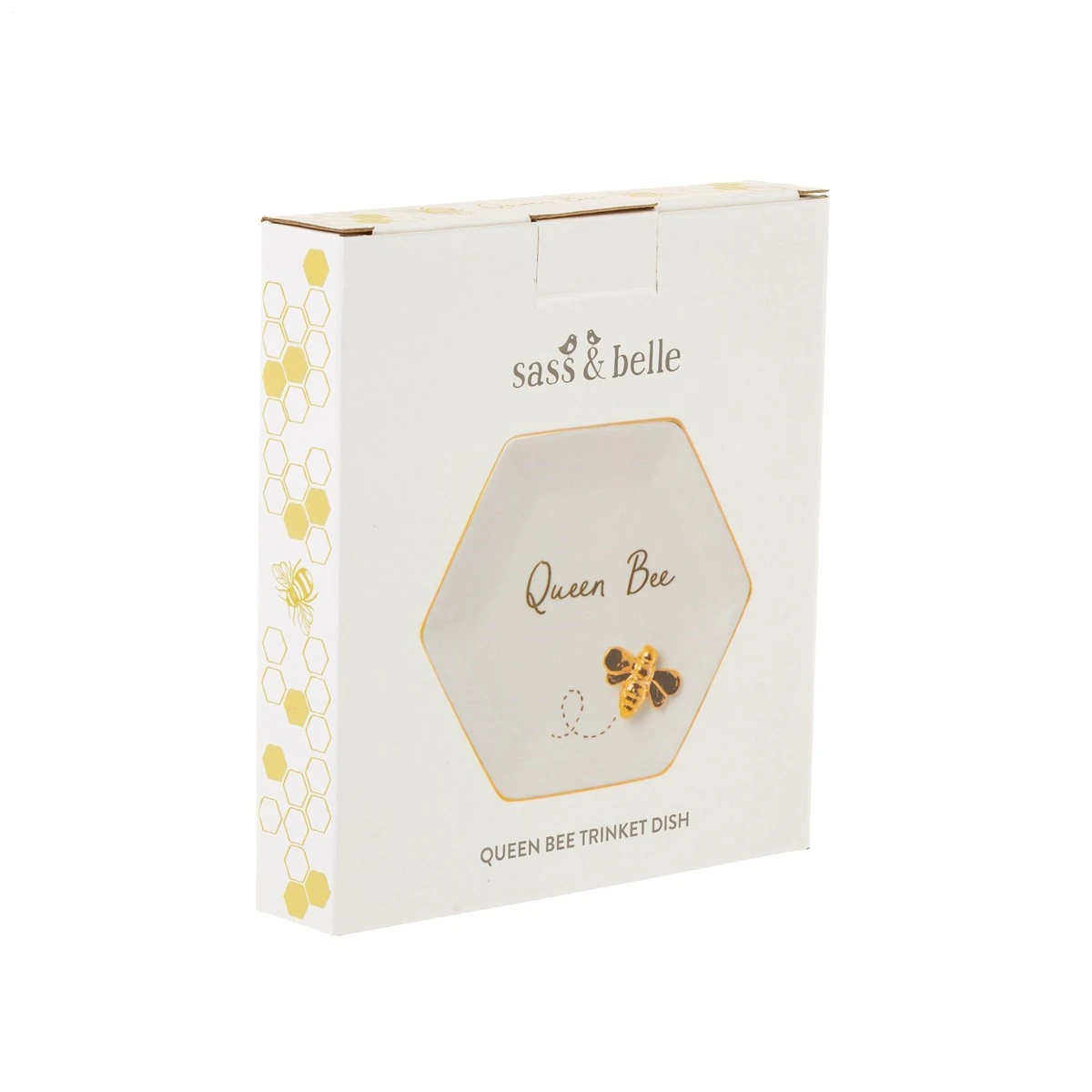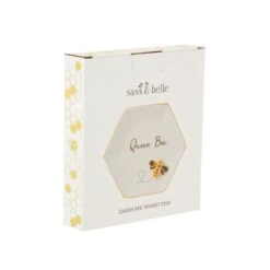 Add a piece of the hive to your home with this dainty trinket dish, featuring the gold Queen Bee herself. The clean white hexagon shape is outlined with a metallic gold, perfect for framing your favourite jewels. The minimalistic style makes it a lovely addition to your dressing table.