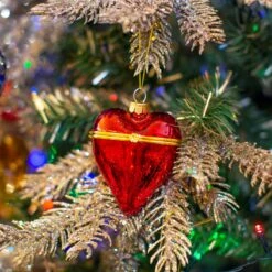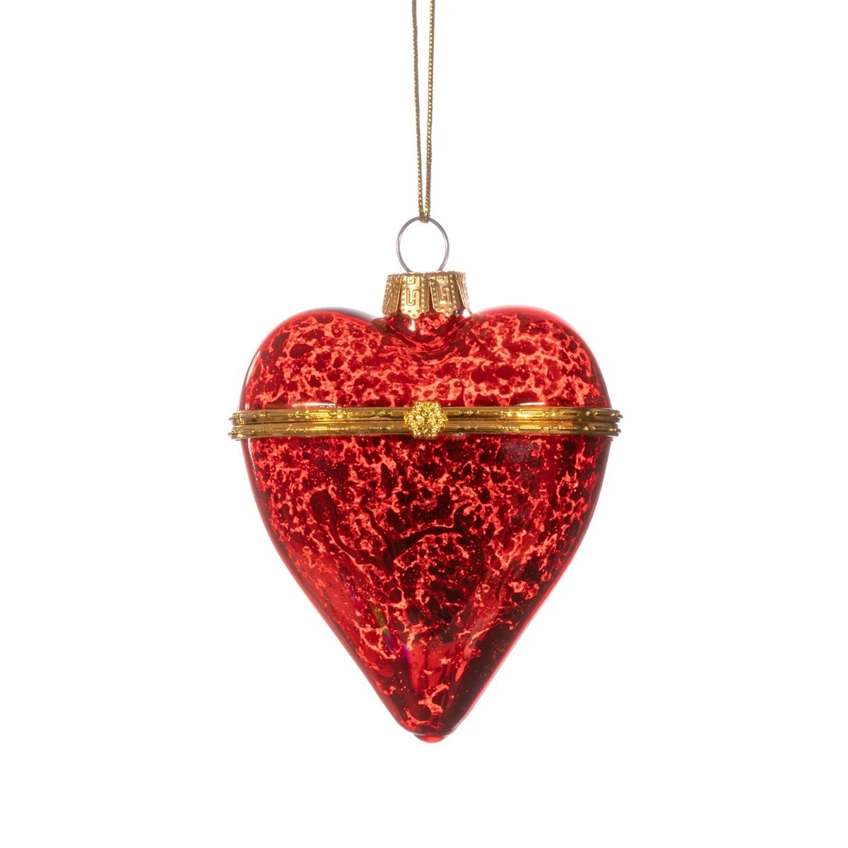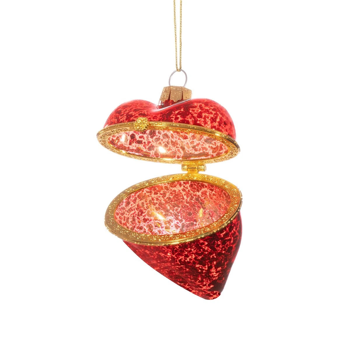 Embrace true love over the festive season with this hanging bauble. Featuring a ruby red colourway with details of gold, this heart shaped decoration is made from glass and can be opened like a locket to store a precious trinket inside.