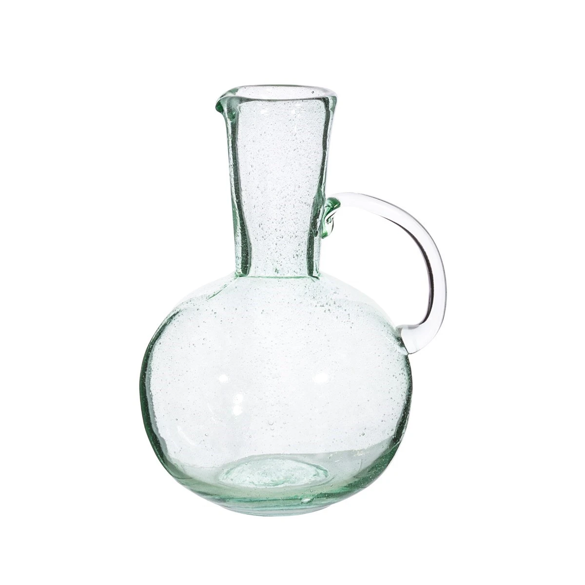 A must-have for creating a beautiful tablescape. Made from recycled glass with a clear glaze, this minimalist vase is round in shape with a tall spout and handle. Perfect for serving refreshments or displaying a pretty bunch of blooms.