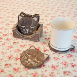 These charming coasters are a delight for dining. They are made out of hand carved wood and come in a useful wooden cradle, perfect for storing away when not in use. Each coaster has the cute cat features carved into the wood, along with cute little eyes, whiskers and a nose. The set consists of six coasters.