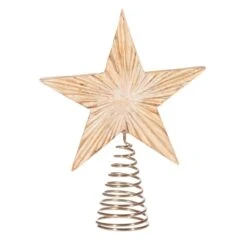 Just what you needed to finish the Christmas tree! Carved from mangowood and set on a spiral iron stand, this tree topper features a classic star shape with a rustic finish.